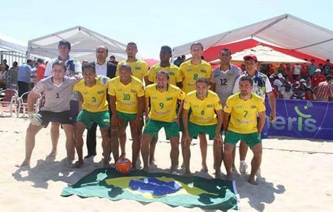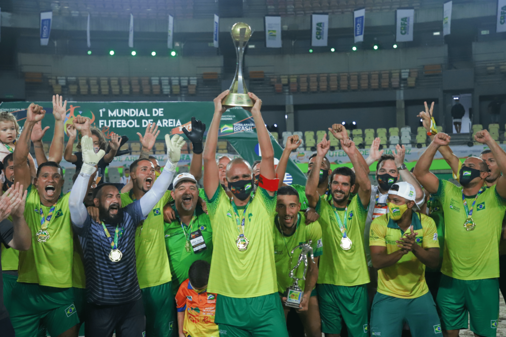 Seleção brasileira campeã do 1º Mundial de Futebol de Areia Raiz em 2020, realizado no Rio de Janeiro.